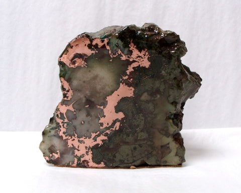 Copper ore decorator end cuts. An extra large ranges from at least 10 pounds and larger each. Each decorator is priced at $23.00 per pound wholesale. Native copper with interesting rock formations occurs in veins, spots, streaks or large masses mixed with the rock matrix. The color of the rock may be solid or a mixture of red conglomerate, green epidote, white quartz, or black basalt. The copper ore is discovered in Michigan's Keweenaw Peninsula. Our decorator pieces have been buffed polished and coated to enhance the beauty of the piece. Photos are representative only. Each piece is unique.