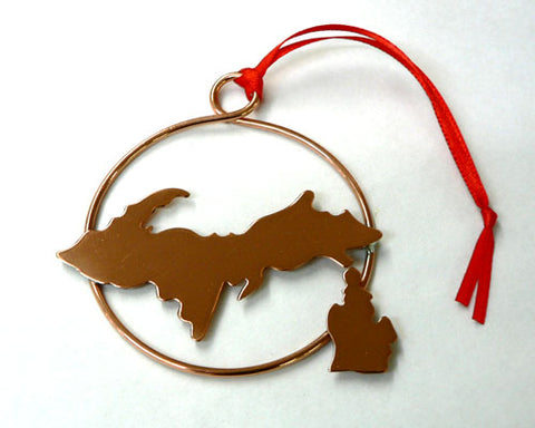 Upper Peninsula and small Lower Peninsula Michigan ornamnet made from sheet copper and suspended in a copper ring. Each ornamnet is strung with a red, green or white ribbon. Copper U.P. is approximately 3". Small hanging Lower Michigan is approximately 1".