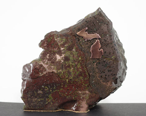 Copper ore decorator end cuts. Native copper with interesting rock formations occurs in veins, spots, streaks or large masses mixed with the rock matrix. The color of the rock may be solid or a mixture of red conglomerate, green epidote, white quartz, or black basalt. The copper ore is discovered in Michigan's Keweenaw Peninsula. Our decorator pieces have been buffed polished and coated to enhance the beauty of the piece. Each piece also has copper Michigan cut-outs on the front of the piece. Photos are representative only. Each piece is unique.
