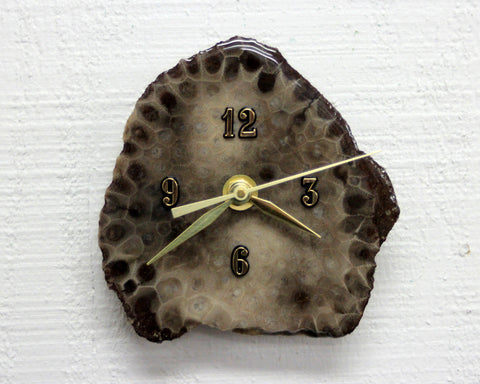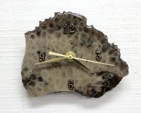This interesting stone is a variety of Calcite. It was formed by the fossilization of ancient coral, Hexagonaria. The coral lived in shallow waters and today's fossil often includes ancient silt and mud. Petoskey Stones are found on many beaches of Lake Michigan and Lake Huron, as well as in rock quarries from Travers City to Alpena. The honeycomb patterned stone has a hardness from 4 to 5 and is the official Michigan State Stone.