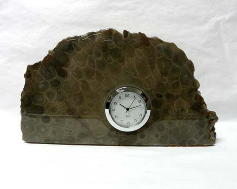 Petoskey stone medium mini quartz clock. A petoskey stone decorator is cored in the center and set with a silver colored mini quartz clock. Photos are representative only. Each piece is unique.