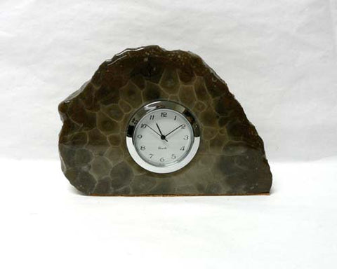 Petoskey stone small mini quartz clock. A Petoskey stone decorator is cored in the center and set with a silver colored mini quartz clock. An epoxy clear coat is applied as well to enhance the pattern of the stone. Photos are representative only. Each piece is unique.