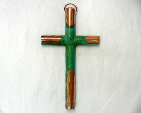 Solid Copper Cross, sand cast in our foundry. Oxidized and buff-polished in select areas. Copper ring for hanging. 12". All are individually handmade, and although sizes remain consistent, the shiny buffed areas will vary from piece to piece. Photos are representative only. Each piece is unique.