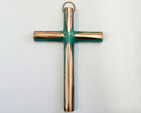 Solid Copper Cross, sand cast in our foundry. Oxidized and buff-polished in select areas. Copper ring for hanging. 9" x 6". All are individually handmade, and although sizes remain consistent, the shiny buffed areas will vary from piece to piece. Photos are representative only. Each piece is unique.