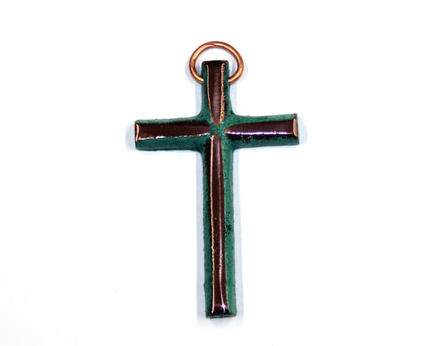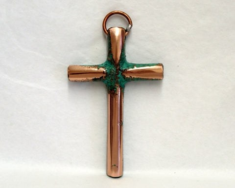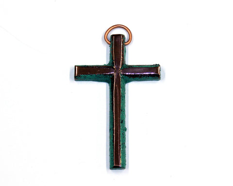 A mini copper cross casting with green patina and buff polished on the front. Cross is approximately 3 1/2" in size. Photos are representative only. Each piece is unique.