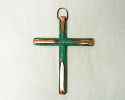 Solid Copper Cross, sand casted in our foundry. Oxidized and buff-polished in select areas. Copper ring for hanging. Measures to approximately 6"x4 1/2". All are individually handmade, and although sizes remain consistent, the shiny buffed areas will vary from piece to piece. Photos are representative only. Each piece is unique.