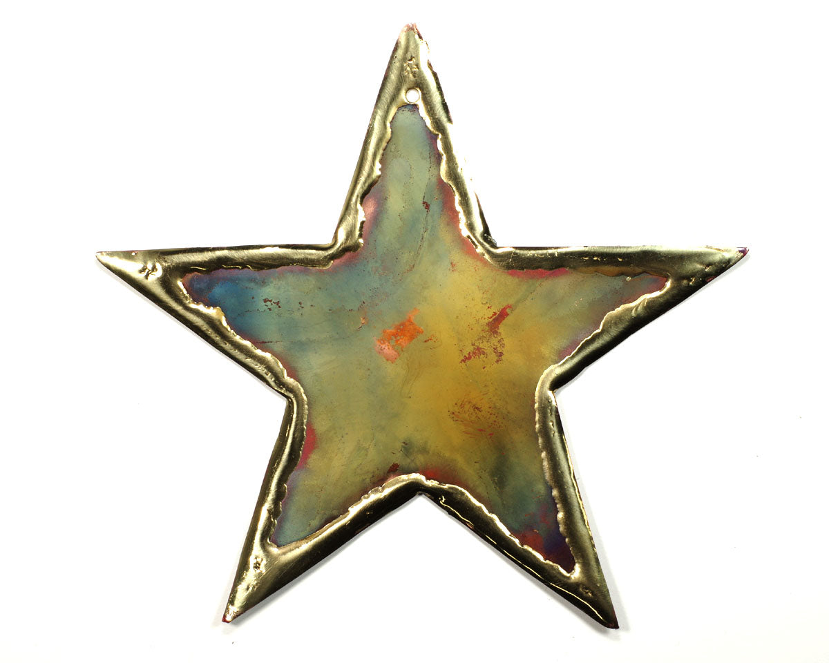 A copper art star magnet with brazed edges. Torching adds color to the copper. The size of the leaf is approximately 4 1/2" x 41/2 ". Photos are representative only. Each piece is unique.