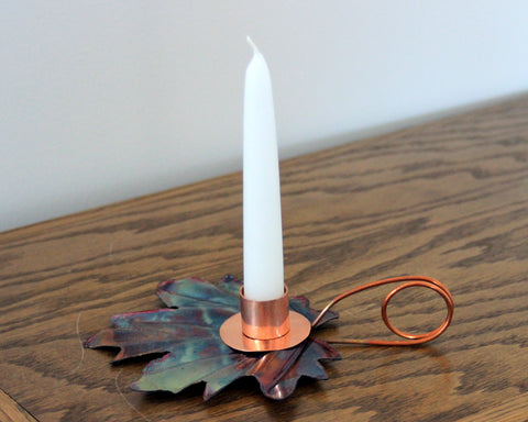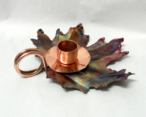 A copper art maple leaf candle holder with brazed edges. Torching adds color to the copper. Copper ring is attached to the leaf for easy holding. Copper cap in the center for taper candles. The leaf size is about 5 1/2" x 5". Photos are representative only. Each piece is unique.