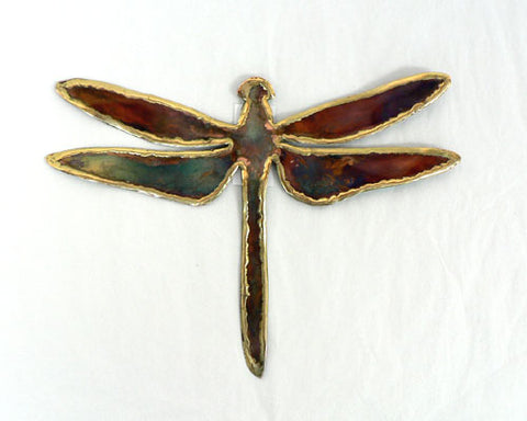 Handmade Copper Art Dragonfly. This artistic piece is made from heating and piecing sheet copper to create this dragonfly. Hook on the back to hang on the wall. Copper is heated to create many colors. The piece is approximately 10"L x 8"W. Photos are representative only. Each piece is unique.