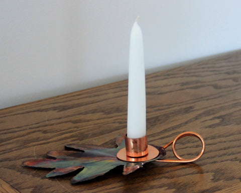 A copper art oak leaf candle holder with brazed edges. Torching adds color to the copper. Copper ring is attached to the leaf for easy holding. Copper cap in the center for taper candles. The leaf size is about 4 1/2" x 6". Photos are representative only. Each piece is unique.