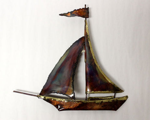 Handmade Small Copper Art Sailboat Wall Décor. This artistic piece is made from heating and piecing sheet copper to create this sailboat. Hook on the back to hang on the wall. Copper is heated to create many colors. The piece is approximately 16"L x 16"W. Photos are representative only. Each piece is unique.
