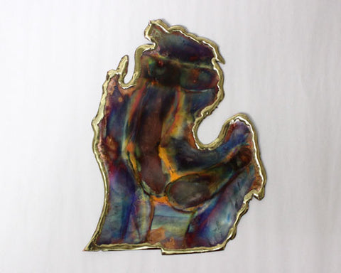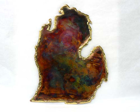 A copper art small Lower Michigan with brazed edges. Torching adds color to the copper. Copper hooks are on the back for wall hanging. The size of the Lower Michigan is about 7 1/2" x 6". Photos are representative only. Each piece is unique.