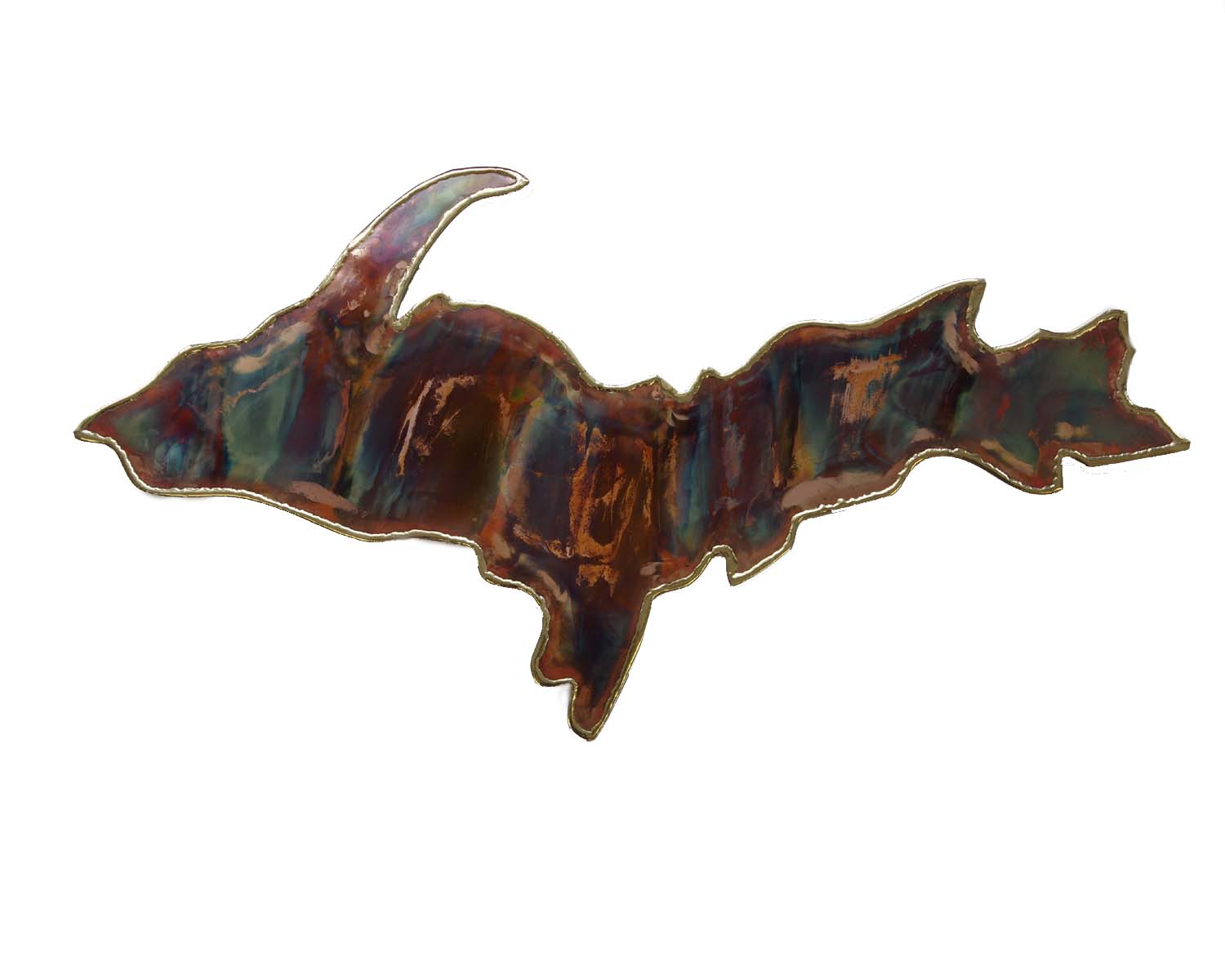 A copper art large Upper Peninsula magnet with brazed edges. Torching adds color to the copper. The size is approximately 1 3/4" x 3". Photos are representative only. Each piece is unique.