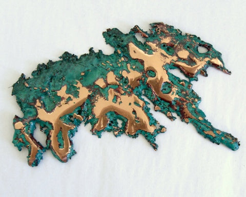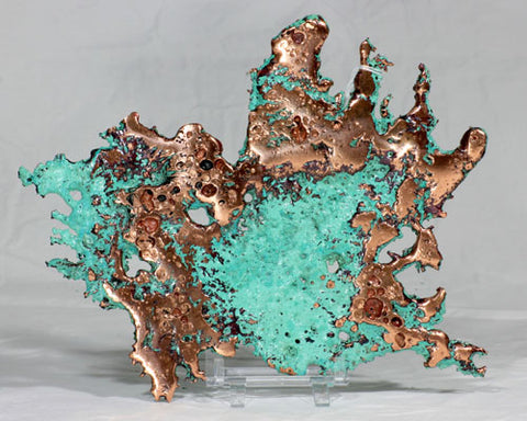 Splash Copper Sculptures are made by pouring molten copper at 2200 degrees Fahrenheit into trays filled with water and straw. When the shapes are cooled, a green colored chemical patina is applied, then highlights are buff polished to expose the glowing solid copper underneath. The sculptures are sprayed to preserve the finish and to prevent the copper from tarnishing.