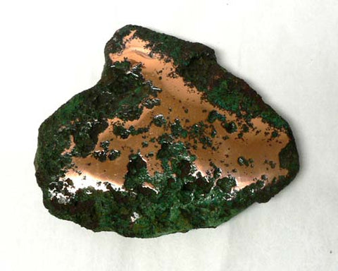 Exposure to the soils, water, and air has oxidized the copper surface a bright green. These specimens with the natural oxidation color, provide a good contrast to the polished copper surface of the cross section.